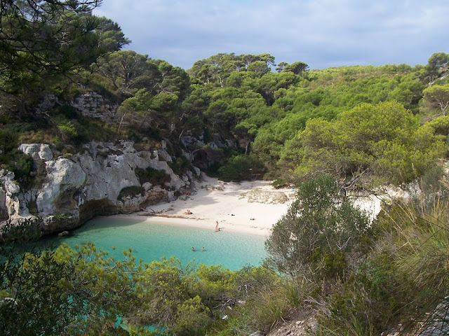 Cala Macarelleta- Menorca - Una imagen recurrente cuando se evoca el Mediterráneo reúne en la nebulosa de los pensamientos una cala desierta de arena resguardada por paredes de roca cubiertas de vegetación y enfrente, aguas turquesas incitadoras al baño. A esta cala se llega por mar o caminando desde otra playa, Macarella, que ejerce como hermana mayor. Por eso, se resiste a la masificación, un placer para los sentidos.